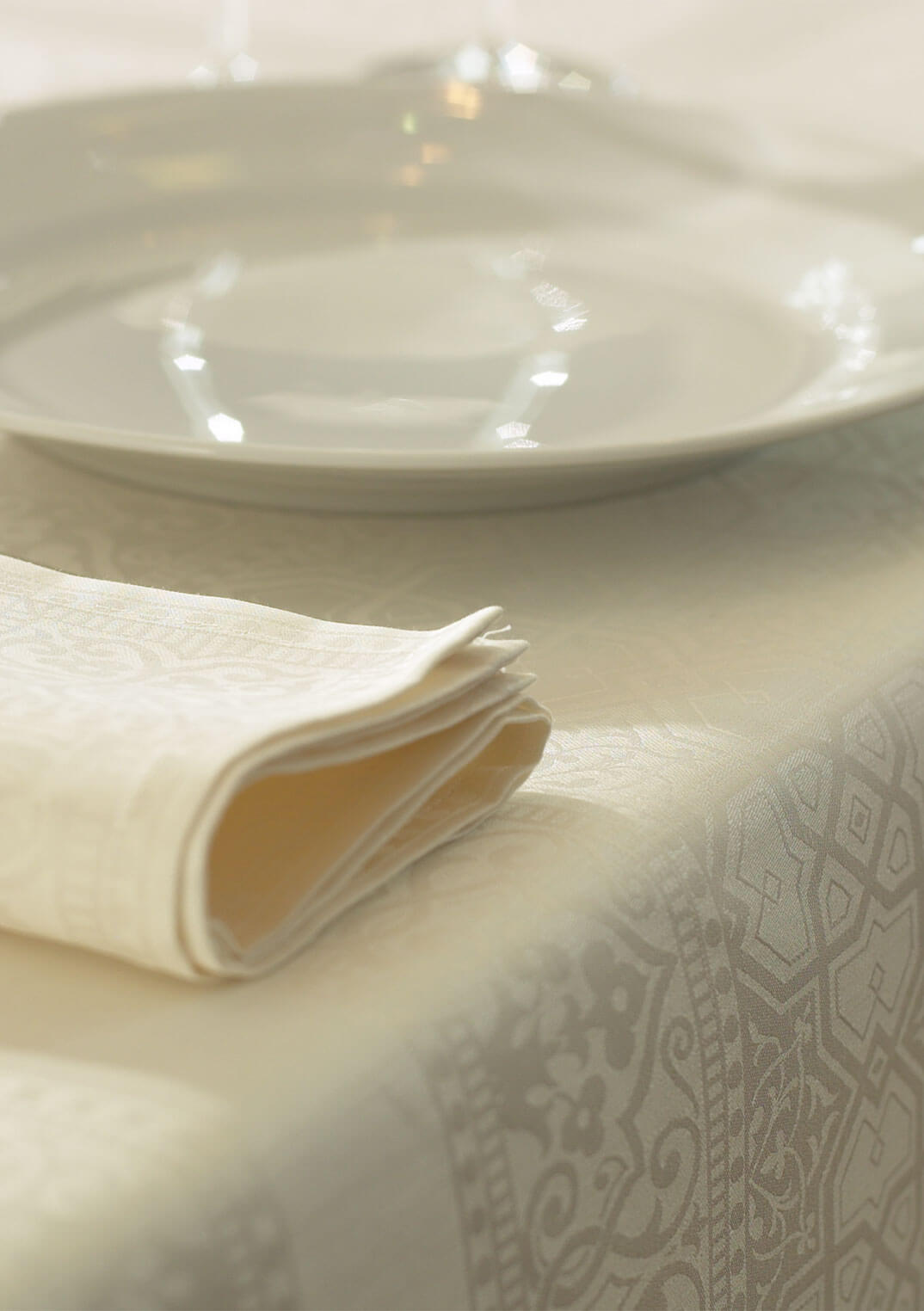 Die Reinleinen-Tischdecke ALKAZAR gehört zum Feinsten und Besten, das je in unserer Jacquard-Weberei geschaffen wurde.